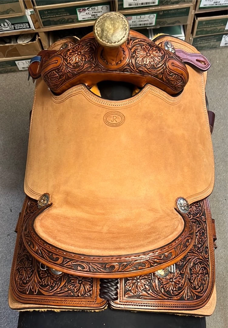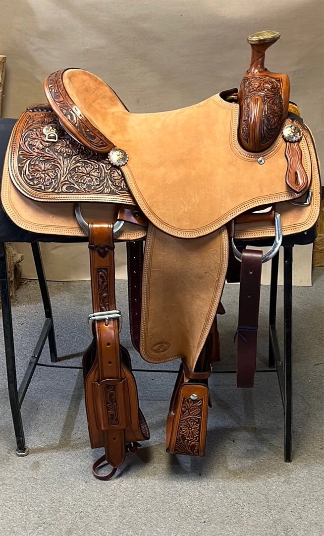 1/4 tool floral, double line border, hard seat, leather covered tooled stirrups