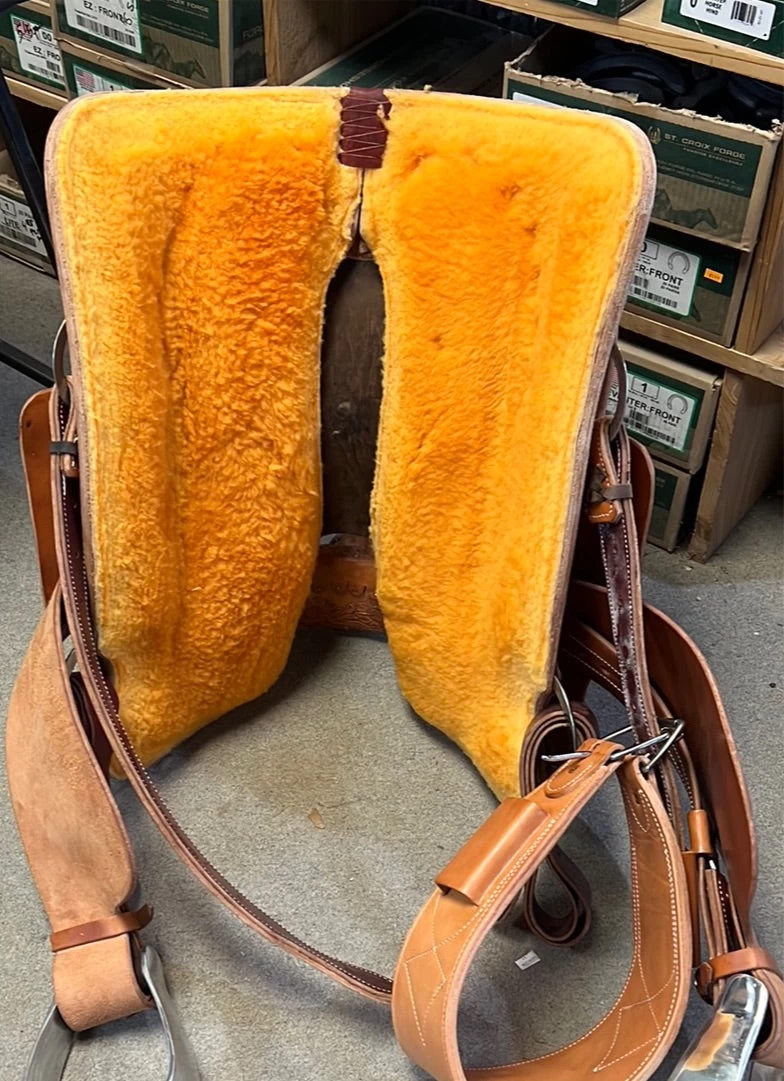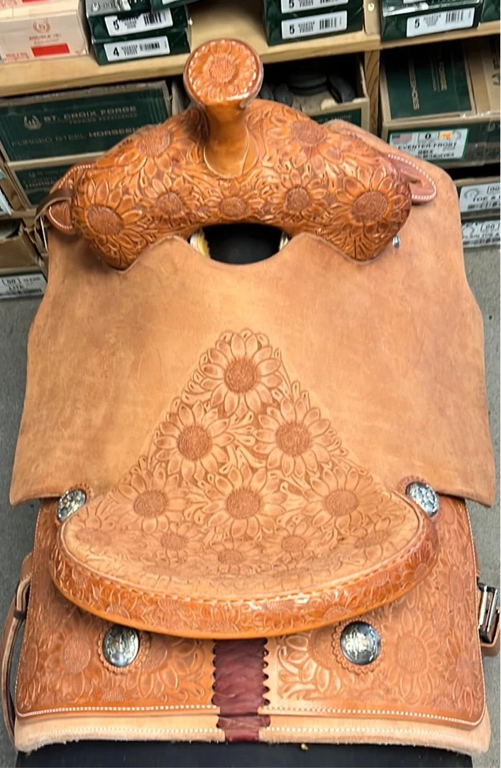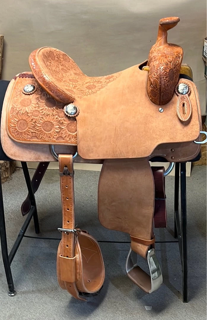 1/4 tool sunflower, tooled hard seat, leather cantle binder, DM conchos, medium oil finish, slanted stirrups