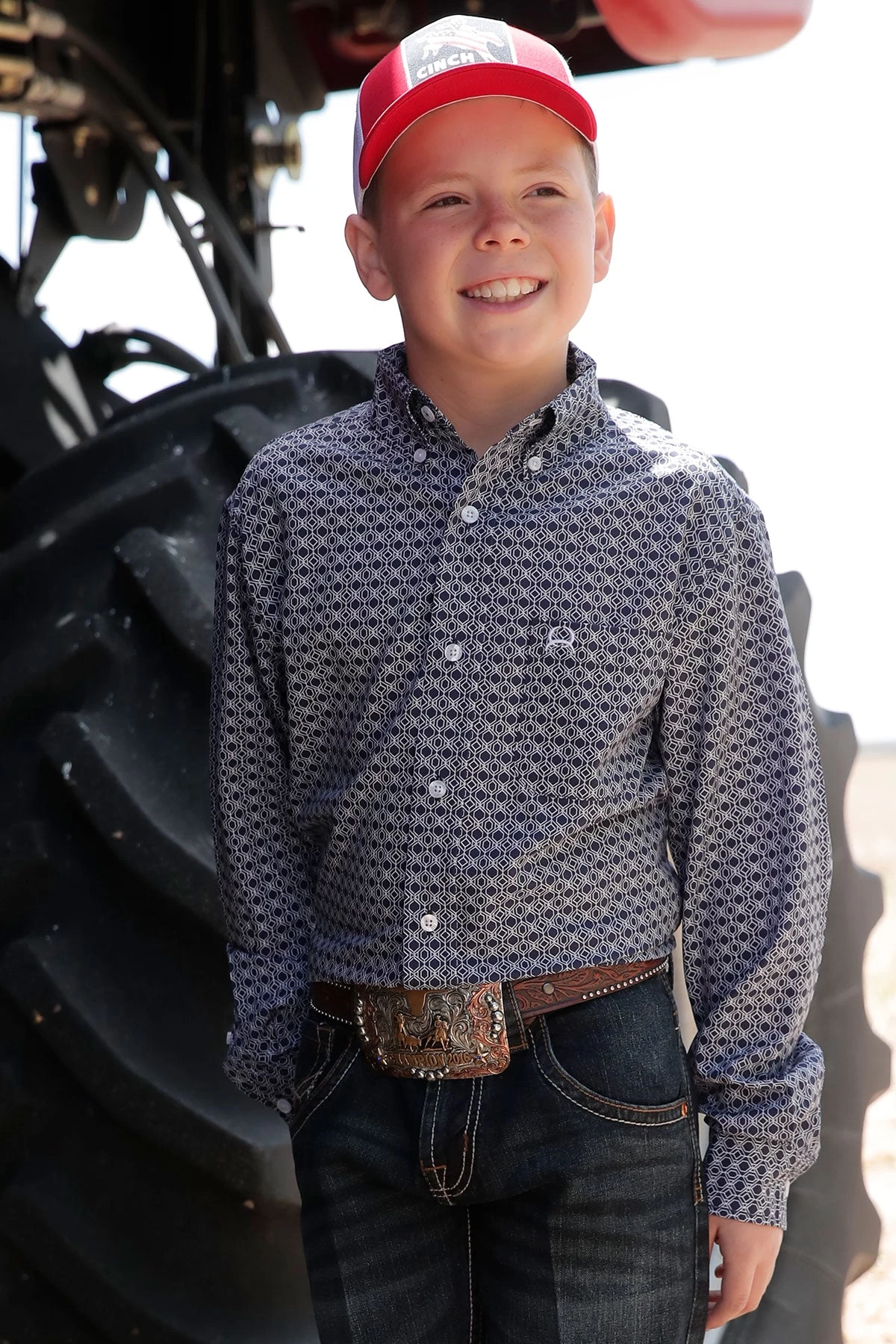 Cinch Boys Arenaflex Shirt. Keep him looking sharp in a handsome Arenaflex like this Navy printed version by CINCH. Lightweight and flexible, this shirt features poly-spandex construction, an open left front pocket with logo embroidery and blue buttons.