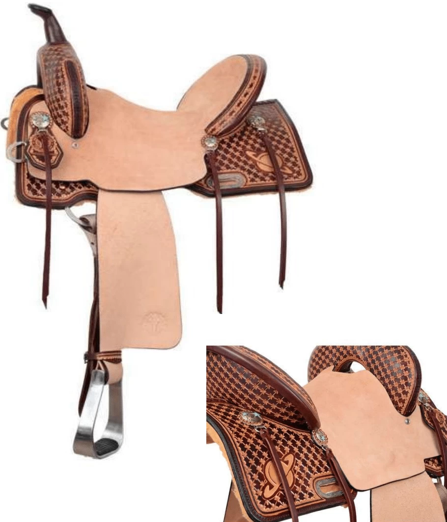 1/2 Tool Saturn with box diamond geometric stamps , vintage finish, custom turquoise star conchos and hard seat. 4.5″ Cantle and 13” Swell for an extra secure seat !