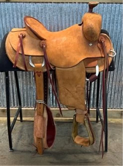 A Wade look with a deep seat, 5″ cantle, Apache seat and iron bucking horse concho