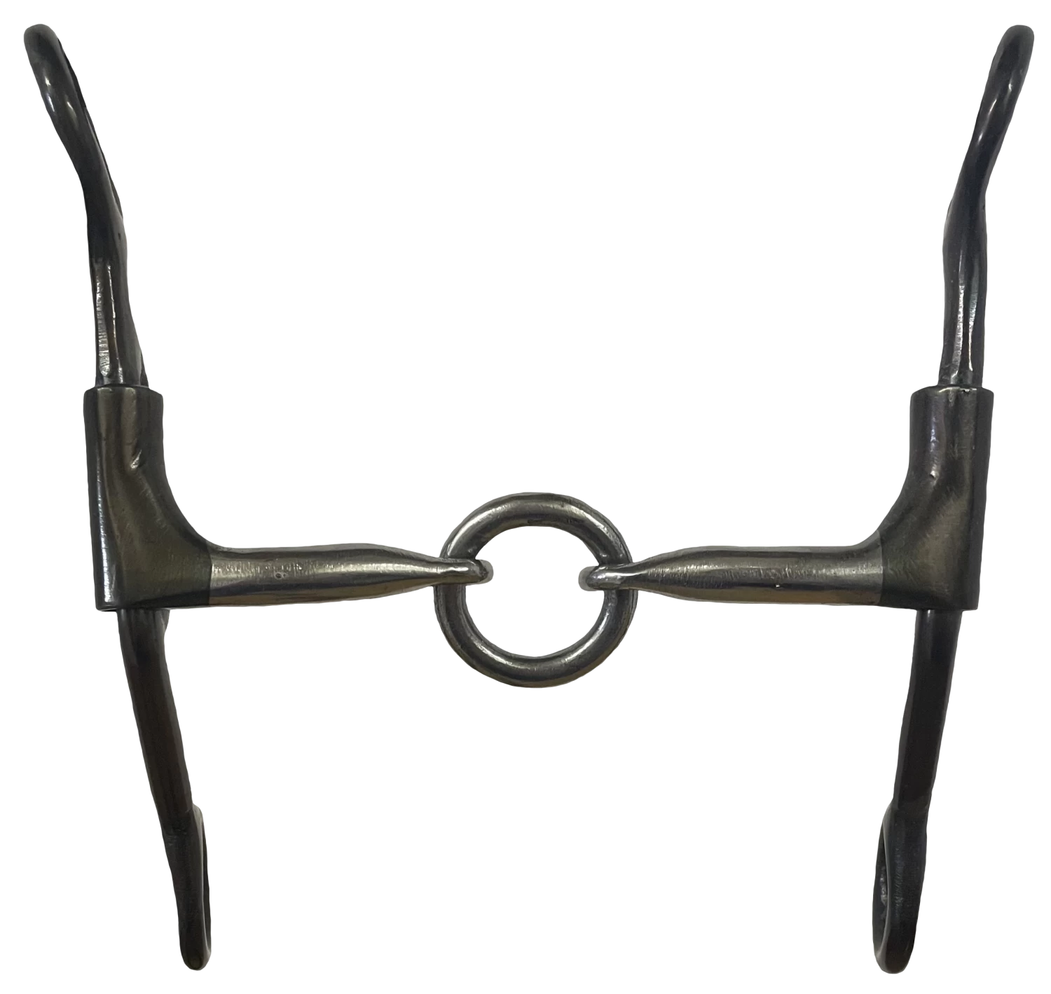 LMS Short, medium swept back cheek. Medium severity, 3 piece mouth with 1-1/2″ center ring allowing good reach to the outside pressure points of the bars enhancing bend. The center ring works primarily on tongue pressure encouraging flex at the poll, also adding in achieving headset and collection.
