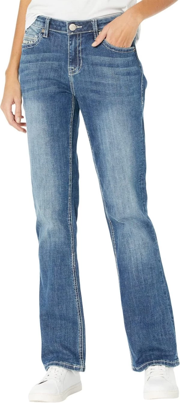 - Forget those boring denims and try out the Rock and Roll Cowgirl® Mid-Rise in Medium Wash W1-2705, featuring a stylish bootcut design with attractive embroidery on the back.