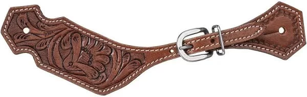 This spur straps features a beautiful floral tooling with uniquely shaped contour, contrast stitching and are adjustable. Medium oil leather finish. Adult size.