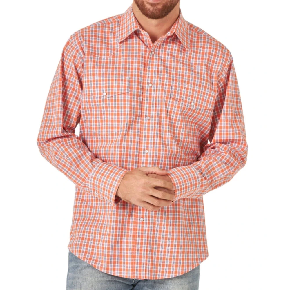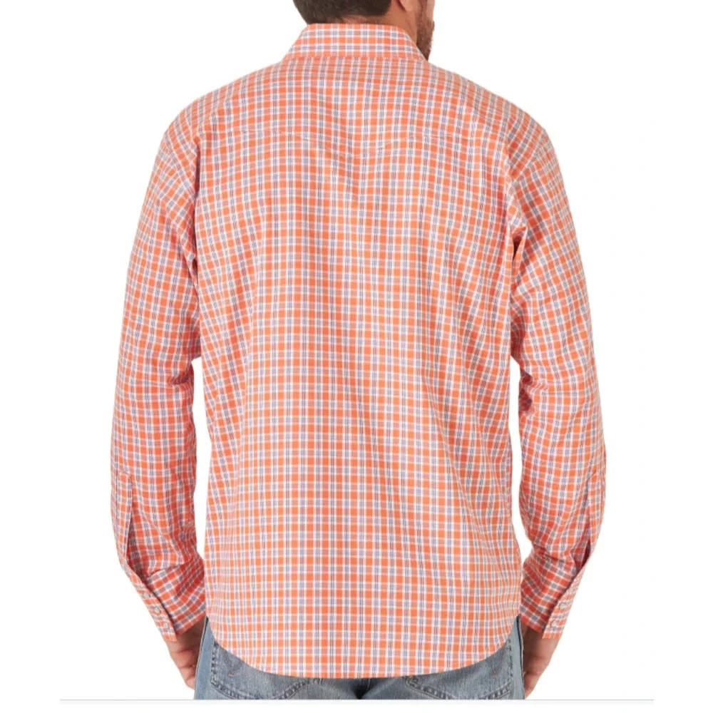Wrangler Men’s Orange Plaid Wrinkle Resistant Stretch Long Sleeve Western Snap Shirt